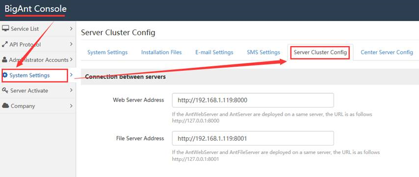 Launch your BigAnt console > System Diagnose > System Settings > Server Cluster Config