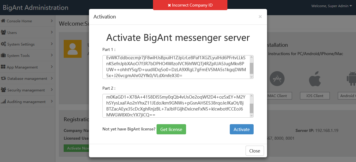 Reason: Your company activation code doesn't match your current company ID. Please note, each time when you reinstall the BigAnt sever console, your company ID will be changed.